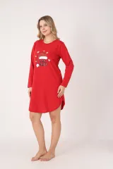 Rochie de damă cu mânecă lungă, lungime până la genunchi, în culoare verde, cu imprimeu festiv cu căciulă de Crăciun și mesajul „Ho Ho Ho”, realizată din material 50% bumbac și 50% poliester.