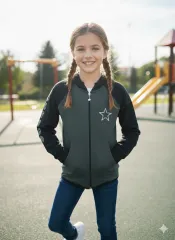 Partea frontală este decorată cu un imprimeu stelută și text „Girls Team”, iar pe mânecă se regăsește un imprimeu scris „Let’s Go”, adăugând un plus de stil și energie tinerească. Culoarea gri închis, combinată cu mânecile și gluga negre, creează un contrast modern și elegant.