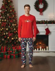 Pijama de Crăciun pentru bărbați, cu bluză roșie și pantaloni bleumarin, realizată din material 50% bumbac și 50% poliester, decorată cu figurine festive de Crăciun.
