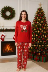Pijamă de Crăciun pentru damă, cu bluză și pantaloni roșii, decorate cu imprimeu Moș Crăciun „Ho Ho”. Confortabilă și festivă, realizată din 50% bumbac și 50% poliester.
