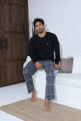 Pijamale pentru bărbați, confecționate din 100% bumbac, formate din bluză albastra cu mânecă lungă și buzunar la piept, asortată cu pantaloni lungi în carouri cu buzunare laterale.